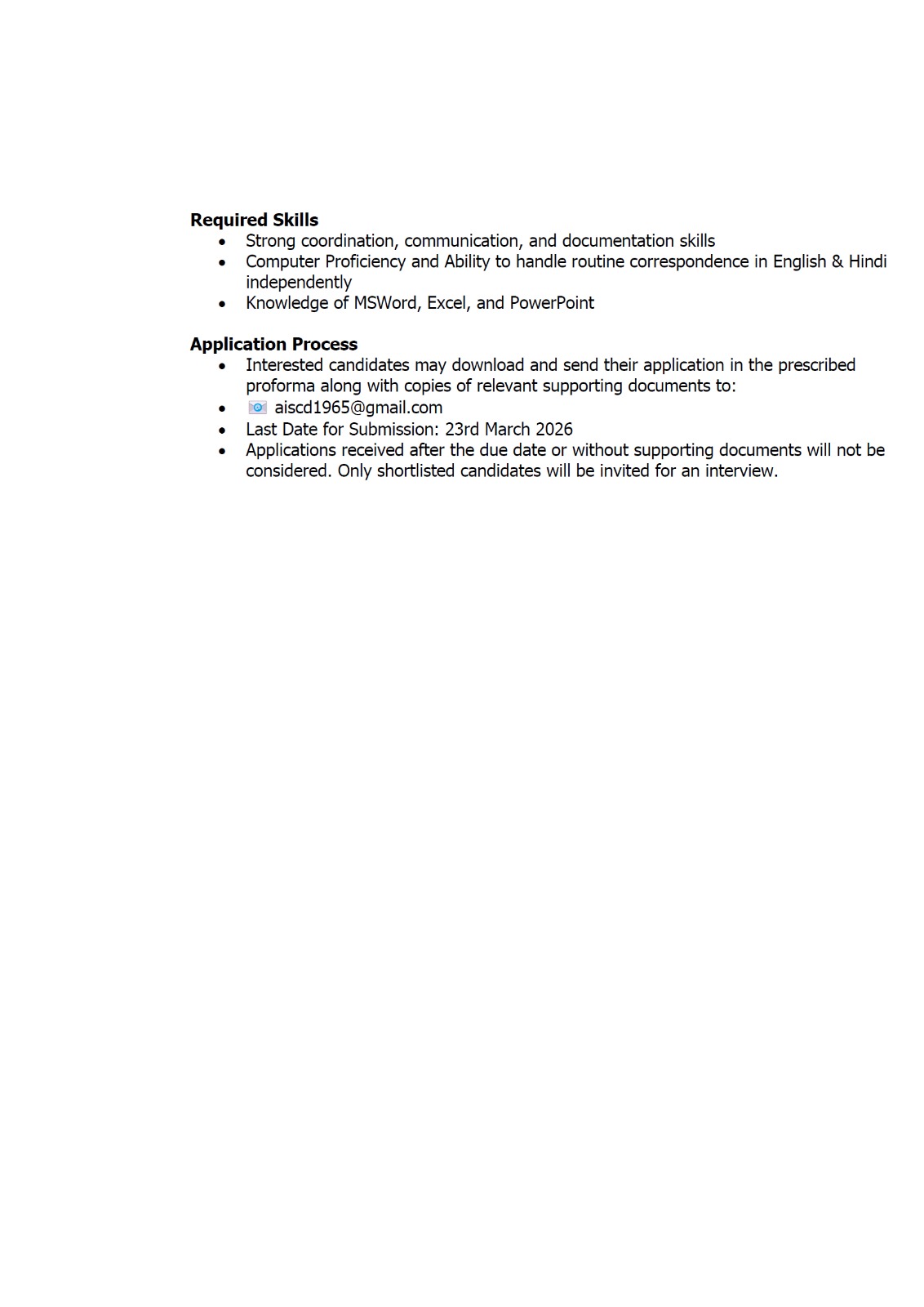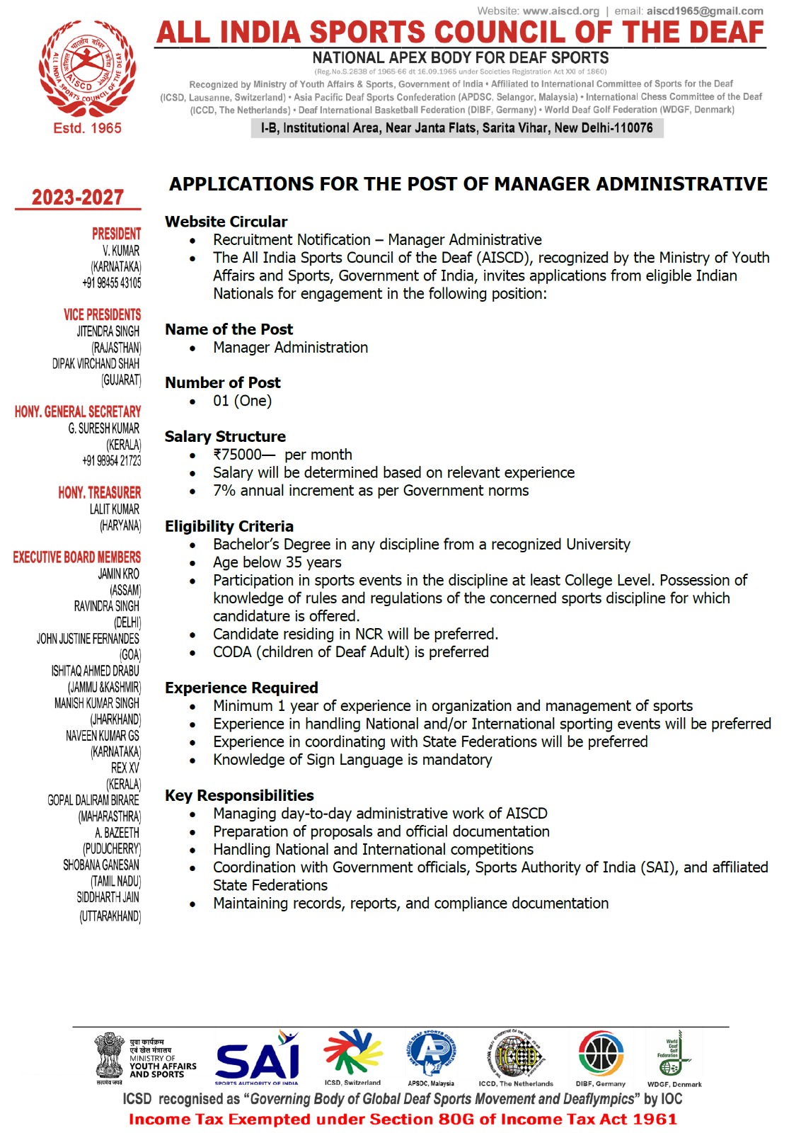Require a Post of Manager Administrative in AISCD Office, New Delhi